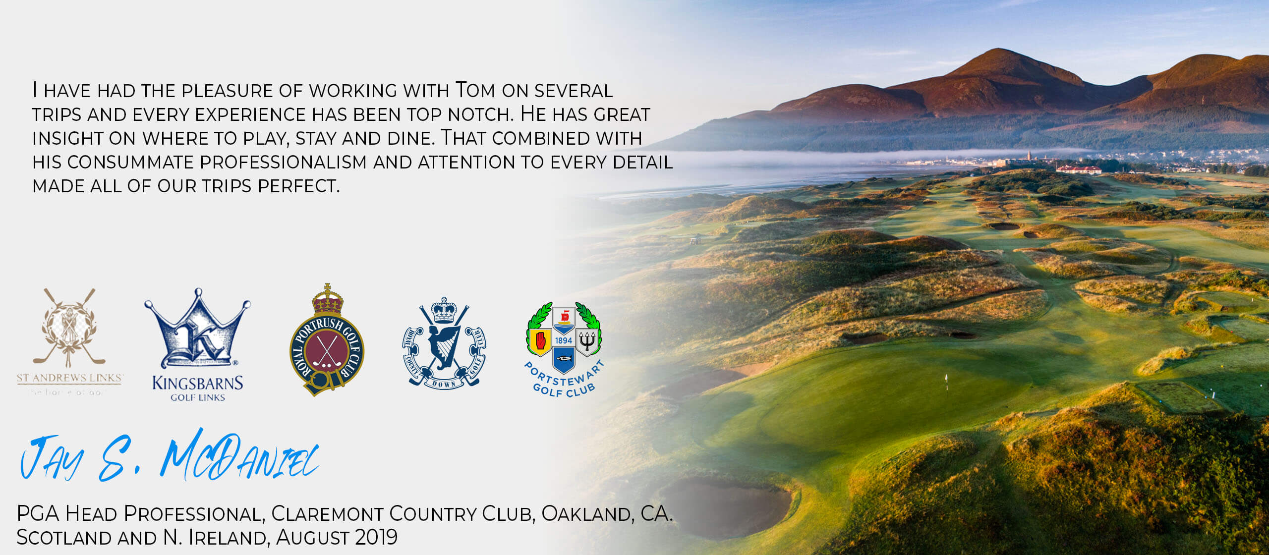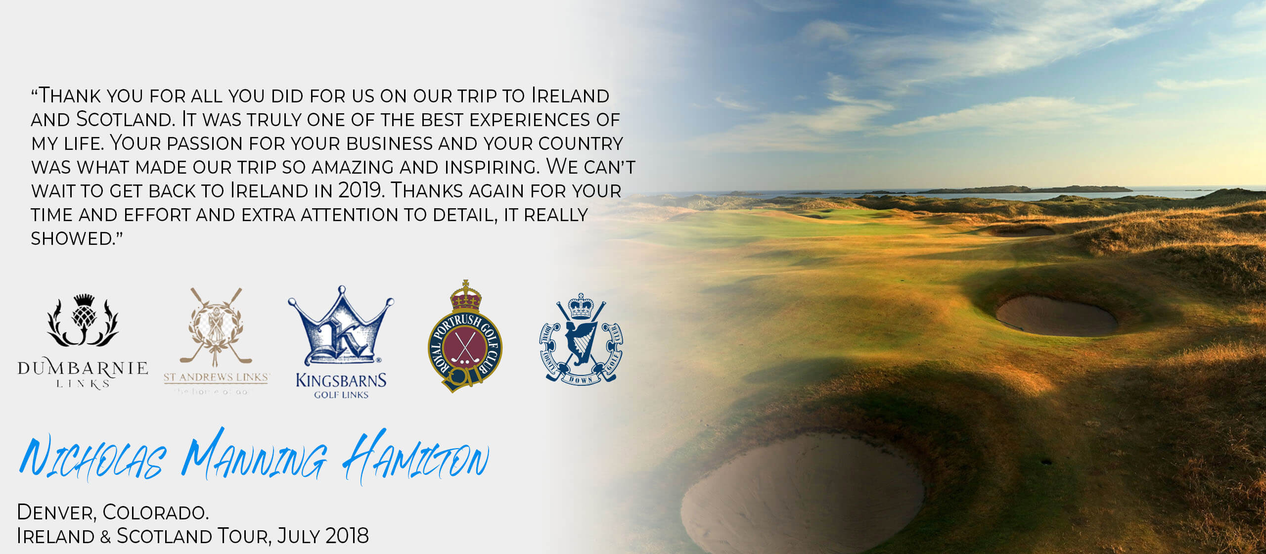 The Consummate Pro is Ireland’s leading Golf Tour Operator. We create custom golf vacations to Ireland, Northern Ireland, Scotland, England, Wales and the best destinations around the world. For almost three decades we have been involved in fashioning and delivering golf vacations in Ireland and Scotland for clients from all over the globe. Our aim when we start creating every client itinerary is simple. We set out to produce an unforgettable golf vacation that in effect is, ‘your trip, your way’. We listen intently to our clients wishes and desires and then we do everything we can to not only match them, but to exceed them with the itineraries we produce. So whether it is Royal Co. Down or Ballybunion, The Old Course in St. Andrews or Carnoustie, or Royal Birkdale or Sunningdale, we inject the same attention to detail into each and every itinerary we produce. If you are in any doubt about whether we can deliver for you and your guests, please take a look through our testimonial section below and don’t hesitate to contact us for a quote.