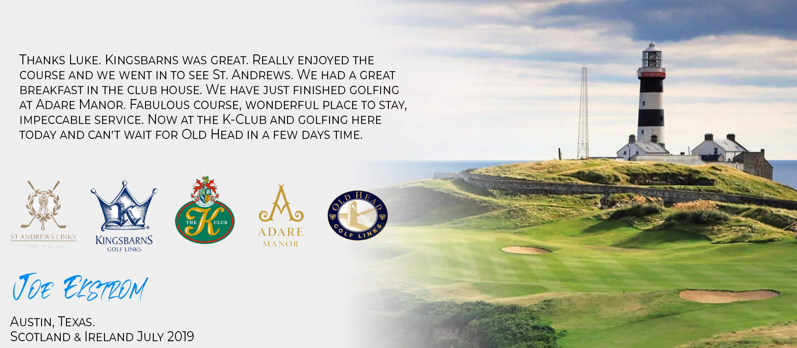 As the leading golf tour operator in Ireland we have the expertise and experience to deliver your perfect golf vacation. We pride ourselves on our golf knowledge and attention to detail. Our relationships in the industry are second to none and this helps us to deliver the best experience for you and your guests. So whether you are looking for a golf trip for a bunch of buddies, a couples trip, or a group experience that combines the best links golf courses in Ireland with the best cultural experiences, then look no further. As members of IAGTO, the International Association of Golf Tour Operators, we adhere to the highest professional standards. Our membership ensures that you and your golf vacation are fully covered and insured should anything unforeseen happen, and we have the appropriate financial protections in place to protect you and your money. There is nothing more reassuring than the testimonials of our past clients, and you will find a selection of these below. So, if you are looking for a professional golf tour operator to deliver the golf vacation of a lifetime, please contact us today.